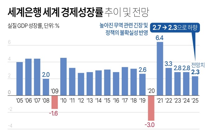 특히 개발도상국의 60%가 올해 성장률 둔화를 겪을 전망이다. 관세전쟁으로 인한 글로벌 물가상승률은 올해 평균 2.9%로 상향 조정했다. 글로벌 성장률을 회복하려면 관세전쟁 해소 등 무역 장벽을 낮추는 방법밖에 없어 보인다.