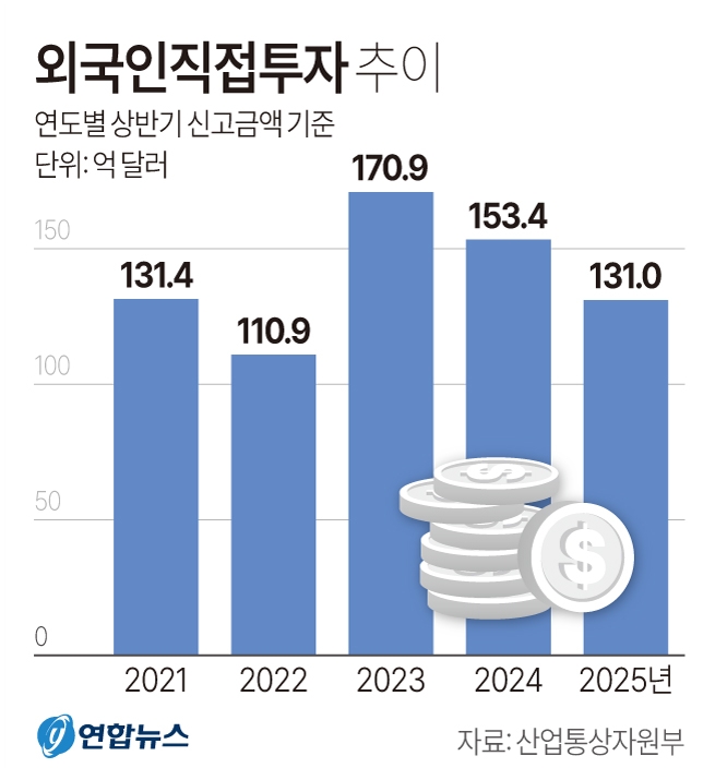 한국의 상반기 외국인직접투자는 신고액 기준으로 131억 달러다. 지난해 상반기의 153억4000만 달러보다 14.6%나 감소한 수치다. 지난해 FDI 실적은 345억7000만 달러로 4년 연속 역대 최고치를 경신 중이다.