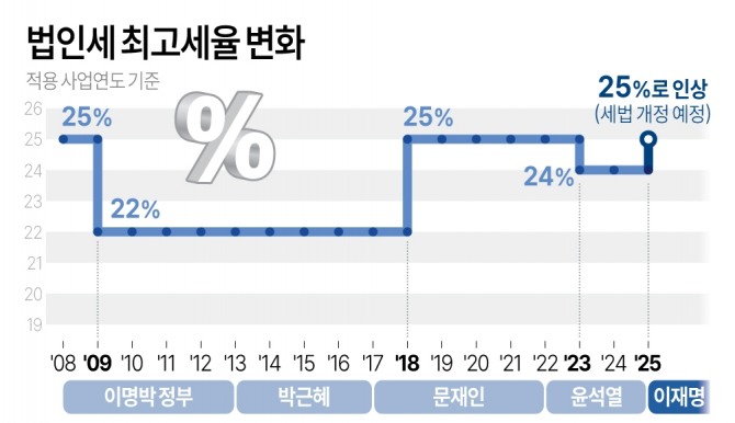 한국 법인세 최고세율은 2009년 25%에서 22%로 내린 후 2017년 25%로 올렸다가 2022년 1%P 낮추는 등 변화무쌍하다.