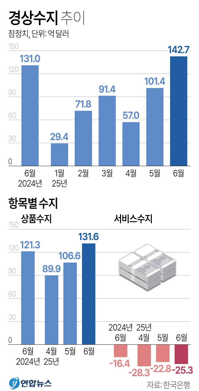 월간 경상수지는 26개월 연속 흑자를 이어가는 중이다. 6월 경상수지를 보면 142억7000만 달러의 흑자로 월간 최대 규모다.