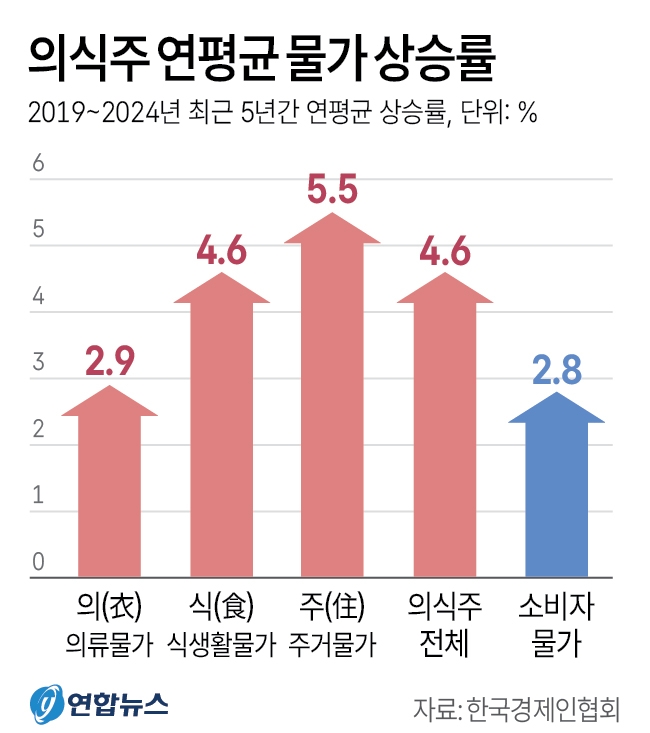 의류 물가(2.9%)마저 소비자물가 상승률보다 높은 상태다. 주거 물가는 관리비가 33.1%나 오른 데다 가스·전기 요금까지 7%나 올랐기 때문이다.