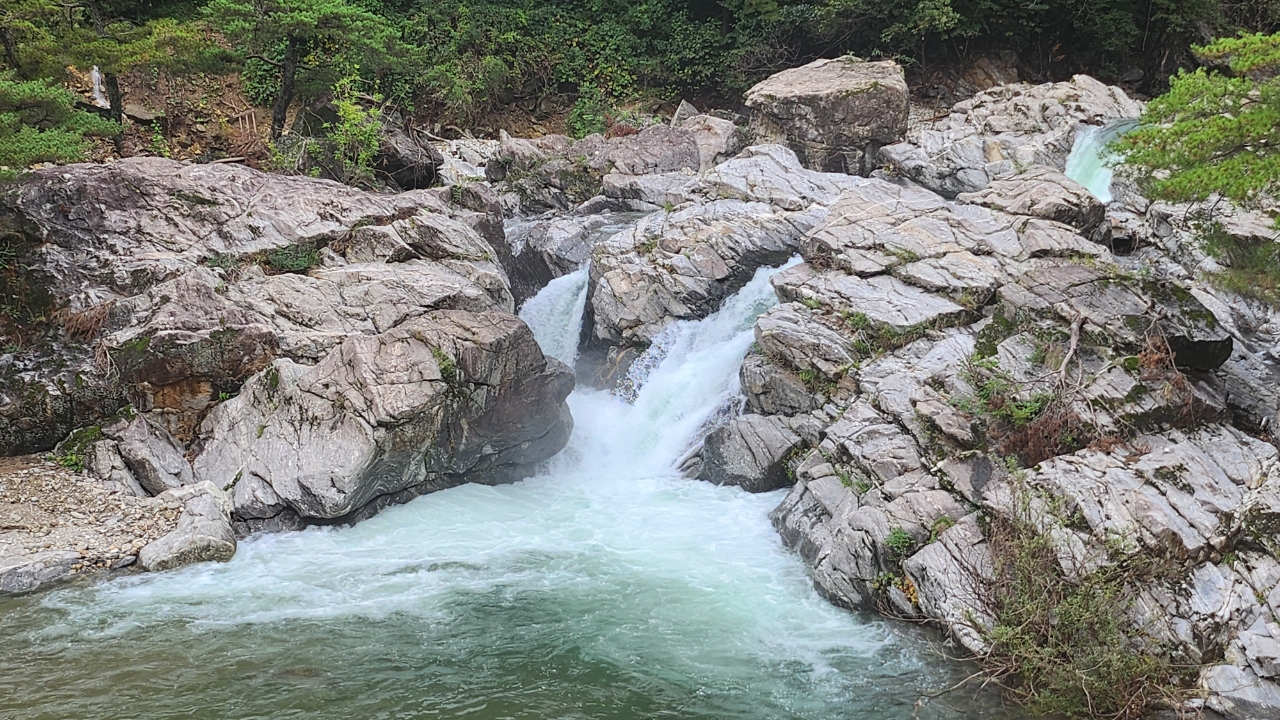 하지만 용추폭포는 멀리서 바라볼 뿐 다가설 수는 없다. 최근 많은 비가 내려 사고 위험이 있어 출입통제선을 쳐 놓았다. 굳이 다가서지 않아도 물소리는 가까이 들리고 물이 흘러내리는 골짜기마다 크고 작은 폭포들이 하얗게 물줄기를 쏟아내며 우리를 반긴다. 간간이 산사태 흔적이 보이고 등산로가 막혀 있기도 하다. 제6곡인 추월담까지 갔다가 물길에 가로막혀 더 나아가지 못하고 되돌아와야 했다. 하지만 물소리를 벗하여 오가는 길은 혼자 걸어도 좋고 벗들과 함께 걸어도 좋은 길이다.