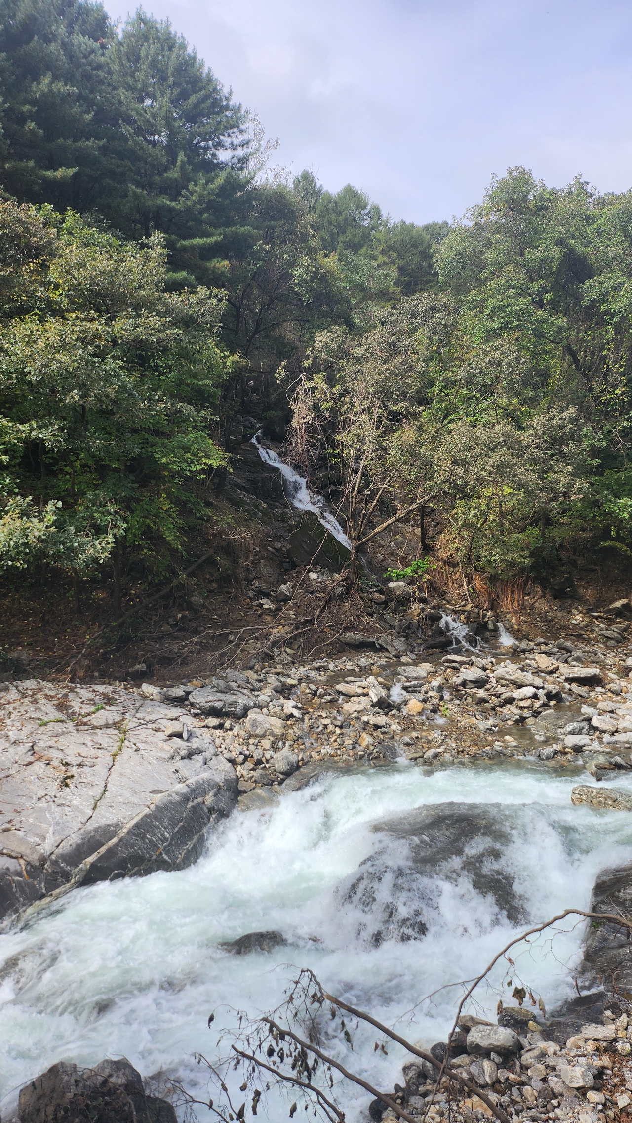 아침 일찍 경춘선 전철을 타고 가서 가평역에서 내려 71-4번 버스를 이용해 용추계곡 입구에 내렸다. 아직도 여름의 기운이 남아있어 단풍을 보기엔 이르지만, 물가의 찰엽수가 일찍 물들어 가을 정취를 자아낸다. 계곡 주차장에서 물소리 길을 따라 트레킹을 시작하려 했지만, 산사태로 통행로가 막혀 있는 바람에 길을 되돌려 다시 용추구곡을 따라 거슬러 올랐다. 우렁우렁 들려오는 물소리를 따라 걷다 보니 제1경인 와룡추(용추폭포)가 시원한 물줄기를 쏟아내며 우리를 반긴다. 용추폭포는 누웠던 용이 하늘로 오르는 모습과 같다고 해서 와룡추 또는 용추라 부르는 경치가 아름답기로 유명한 곳이다.