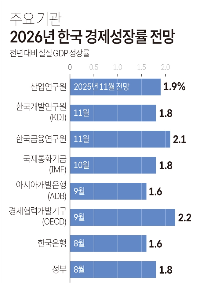 한국개발연구원(KDI)은 한국은행의 내년 경제전망과 비슷한 수치다. 산업연구원도 내년 GDP 성장률을 1.9%로 예상한다.