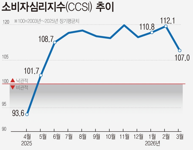 소비 동향을 보여주는 2월 소매판매액지수도 전월과 같은 수준을 유지하고 있다. 여기에 2월 말 발발한 미국·이란 전쟁은 한국 경제성장을 가로막을 요소다.