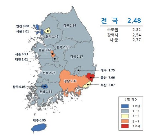 시․도 별로는 울산(7.66%), 세종(6.93%), 경남(5.31%), 부산(3.07%), 서울(3.01%) 등 7개 시․도는 전국 평균(2.48%)보다 상승폭이 높았지만 광주(0.05%), 인천(0.88%), 제주(0.95%), 대전(1.01%), 경기(1.49%) 등 10개 시․도는 전국 평균보다 상승폭이 낮은 것으로 나타났다.