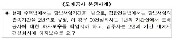 이로인해 실제 현장에서는 하자담보책임기간(주택법)이 지난 경우에도 담보책임존속기간(집합건물법)이 남아 있을 경우 하자보수를 요구하여 분쟁이 발생했던 것이 사실이다.