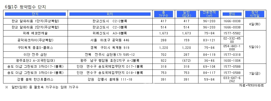 부동산포털 닥터아파트에 따르면, 6월 첫째주 총 10곳, 6404가구가 청약접수를 받는다. 지역적으로는 수도권 3834가구, 지방 2570가구의 청약물량이 예정돼 있다.