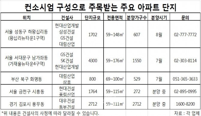 업계 한 전문가는 “대형건설사들의 컨소시엄 구성은 주로 놓칠 수 없는 대단지 알짜 부지이기 때문에 경쟁보다는 타협으로 이뤄지는 경우가 많다”며 “컨소시엄 구성 단지는 단지규모, 브랜드, 입지 등이 뛰어나 내 집 마련 수요자나 투자자들이 눈여겨볼만 하다”고 조언했다.