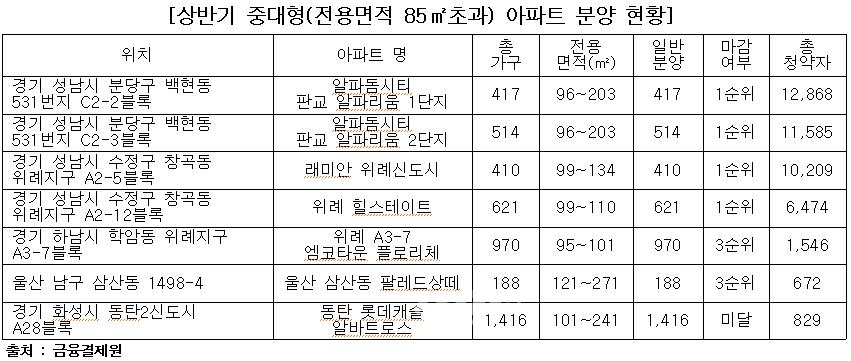상반기 중대형 순위 내 마감비율 86%…위례·판교 등 중대형 1순위 마감