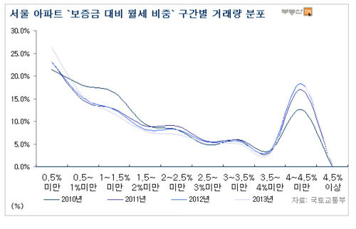 서울의 경우 '보증금 대비 월세 비중이 0.5% 미만'의 계약 형태가 지난 2010년에는 전체 거래량의 21.5%를 차지했으나 2013년 들어서는 26.3%로 4.8% 증가했다. 보증금 비율이 높은 보증부 월세 거래의 비중이 늘어난 것이다.