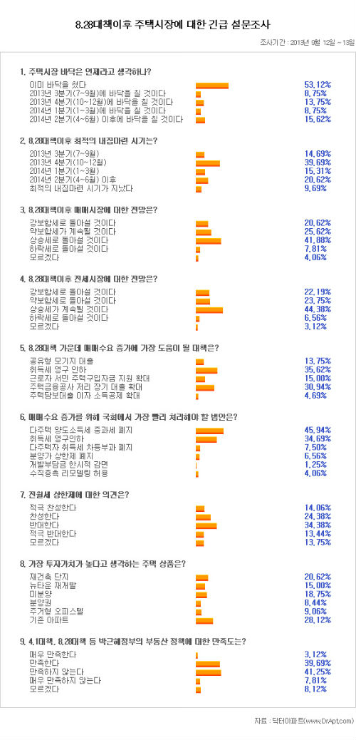 닥터아파트는 지난 12~13일 회원 526명을 대상으로 '8.28전월세 대책' 발표 이후 주택시장에 대한 설문조사를 실시한 결과, 39.7%가 내집마련 최적의 시기로 올 4분기를 꼽았다고 16일 전했다.
