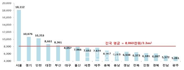 이미지 확대보기전국 17개 시·도 중 민간아파트 분양가격이 가장 높은 지역은 서울로 3.3㎡당 1811만2000원으로 나타났다. 가장 낮은 지역인 광주의 경우 3.3㎡ 528만1000원으로 두 지역 간 아파트 분양가격 차이가 약 3.4배에 달한다.