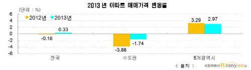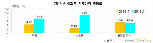 [글로벌이코노믹=부종일기자]KB국민은행(www.kbstar.com)은 부동산정보사이트 KB부동산 알리지(R-easy, www.kbreasy.com)를 통하여 2013년 주택 매매 및 전세시장 동향 결과를 발표했다.조사 결과 2013년 한해 수도권 아파트 전세가격은 9.03% 오른 것으로 나타났다. 이 같은 상승률은 전세난이 심했던 2011년(13.91%)보다는 낮지만 지난해(2.49%)보다는 3.6배 가량 높은 것이다.