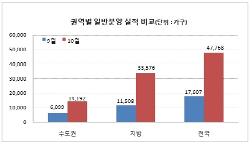 7일 부동산써브에 따르면 10월 전국 아파트(공공임대․주상복합 포함, 국민임대 제외) 일반분양 가구 수는 총 77, 4만7768가구다. 이는 올 들어 가장 많은 물량으로 지난 9월, 1만7607가구와 비교해 3만161가구 늘어났다.