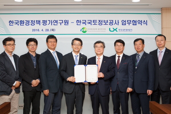 LX공사는 지난 28일 오후 전북혁신도시 소재 본사 회의실에서 한국환경정책·평가연구원과 ‘환경문제 예방을 위한 업무협약’을 맺고 국토정보와 환경분야 발전을 위해 힘을 모으기로 약속했다.