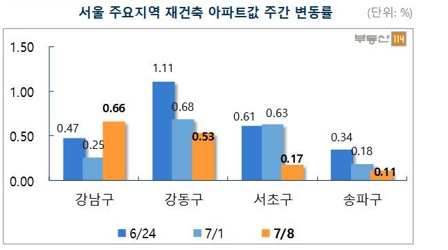 8일 부동산 114에 따르면 7월 첫째 주 서울 재건축아파트의 가격 변동률을 조사한 결과 강동구(0.68%→0.53%), 서초구(0.63%→0.17%), 송파구(0.18%→0.11%) 모두 전주 대비 오름폭이 축소됐다.