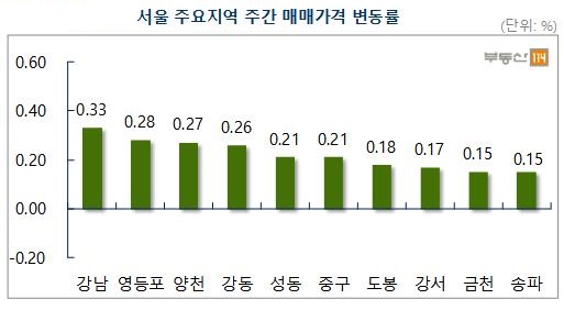 신정동 목동신시가지13·14단지, 목동 목동신시가지1·4단지가 500만원~4000만원 가량 올랐다. 강동은 재건축과 고덕상업업무 복합단지 개발 등의 기대감으로 둔촌동 둔촌주공3·4단지, 상일동 고덕주공3단지 등이 500만원~2500만원 정도 상승했다.