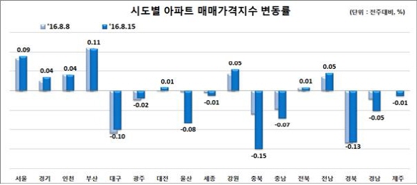 수도권(0.05%)은 지난주와 동일한 상승폭을 유지한 가운데, 서울과 경기의 상승폭은 확대됐으나 인천은 지난주 상승폭을 유지했고, 지방(-0.03%)은 5대광역시의 경우 상승에서 보합으로 전환되고 8개도는 지난 2월1일 이후 28주 연속 하락세가 지속되는 가운데, 조선업 침체로 울산 동구와 거제, 창원 등 경남을 중심으로 지난주 대비 하락폭이 확대(0.02%p)됐다.