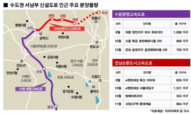 [글로벌이코노믹 최영록 기자] 수도권 서남부 분양시장이 잇단 고속도로 개통으로 들썩이고 있다. 지난 6월 개통된 수원~광명고속도로에 이어 지난 7월 강남순환도시고속도로 1구간이 개통되면서 강남접근성이 한층 향상됐기 때문이다.화성시 봉담읍과 광명시 소하동을 잇는 ‘수원~광명 고속도로(총 27.4㎞)’는 기존보다 약 20분 단축돼 32분만에 도달 가능하다. 금천구 독산동과 강남구 수서동을 연결하는 ‘강남순환도시고속도로’는 지난 7월 광명 소하JCT와 선암IC를 잇는 제1구간이 우선 개통되는 등 강남까지 최대 30분이상 단축될 것으로 예상되고 있다.