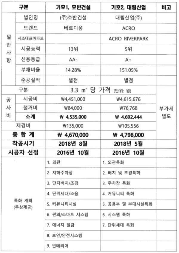 [글로벌이코노믹 최영록 기자] 서울 한강변 최고의 입지, 서초구 신반포7차에서 재건축 시공권 경쟁을 겨루고 있는 대림산업과 호반건설의 입찰제안서가 전격 공개됐다. 그 결과 도급순위 13위인 호반건설이 브랜드파워를 앞세운 대림산업 보다 더 낮은 공사비와 더 우세한 특화계획을 제시하는 등 공격적인 자세를 취한 것으로 분석된다. 이에 따라 조합원들은 브랜드냐 아니면 사업조건이냐를 두고 더욱 깊은 고민에 빠질 것으로 예상된다.신반포7차 재건축조합(조합장 마덕창)은 입찰마감 이후 이사회와 대의원회를 거쳐 대림산업과 호반건설의 입찰제안서 비교표를 10일 공개했다. 기호는 입찰참여 순서에 따라 호반건설이 1번, 대림산업이 2번을 배정받았다.