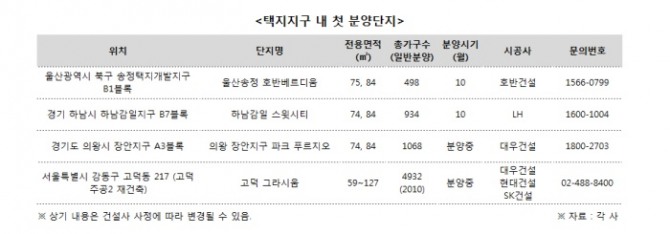 최근 분양시장에서도 택지지구 첫 분양단지들은 높은 청약성적을 거두며 인기몰이를 하고 있다. 지난 5월 하남 현안1지구에 첫 분양한 대우건설 ‘하남 힐즈파크 푸르지오’는 1순위 청약에서 평균 13.1대 1의 경쟁률을 기록, 계약 4일만에 계약을 완료했으며 지난 6월 경기도 고양시 향동지구에서 처음 분양된 ‘고양 향동 리슈빌’ 역시 1순위 청약에서 평균 8대 1의 경쟁률을 기록하며 8일만에 완판됐다.