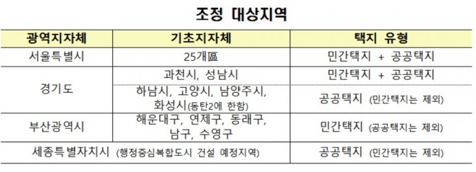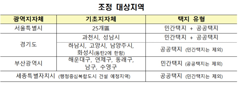 ▲강남4구를 비롯한 서울 전지역(민간·공공) ▲경기도 과천과 성남 민간·공공택지 ▲경기도 하남·동탄2·고양·남양주 공공택지 ▲세종특별시 공공택지 ▲부산 해운대·연제·동래·남구·수영 민간택지 등이다.