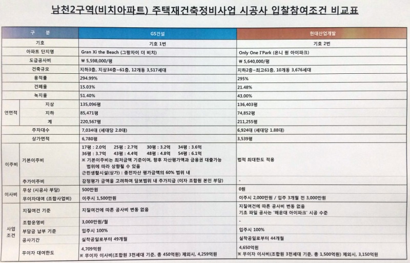 [글로벌이코노믹 최영록 기자] 최근 GS건설과 현대산업개발은 부산지역 최대 재건축단지인 수영구 삼익비치타운 시공권을 놓고 총력전을 벌이고 있다. 이런 가운데 양사의 입찰제안서가 공개돼 업계의 이목을 집중시키고 있다.본지가 입수한 각사의 입찰제안서를 비교하면 GS건설의 사업조건이 현대산업개발보다 더 나은 것으로 분석된다. 부산지역에서 양사의 브랜드는 우열을 가리기 힘들 정도지만 입찰제안서를 비교하면 GS건설이 조합원들에게 더 유리한 사업조건을 제시했다는 얘기다.