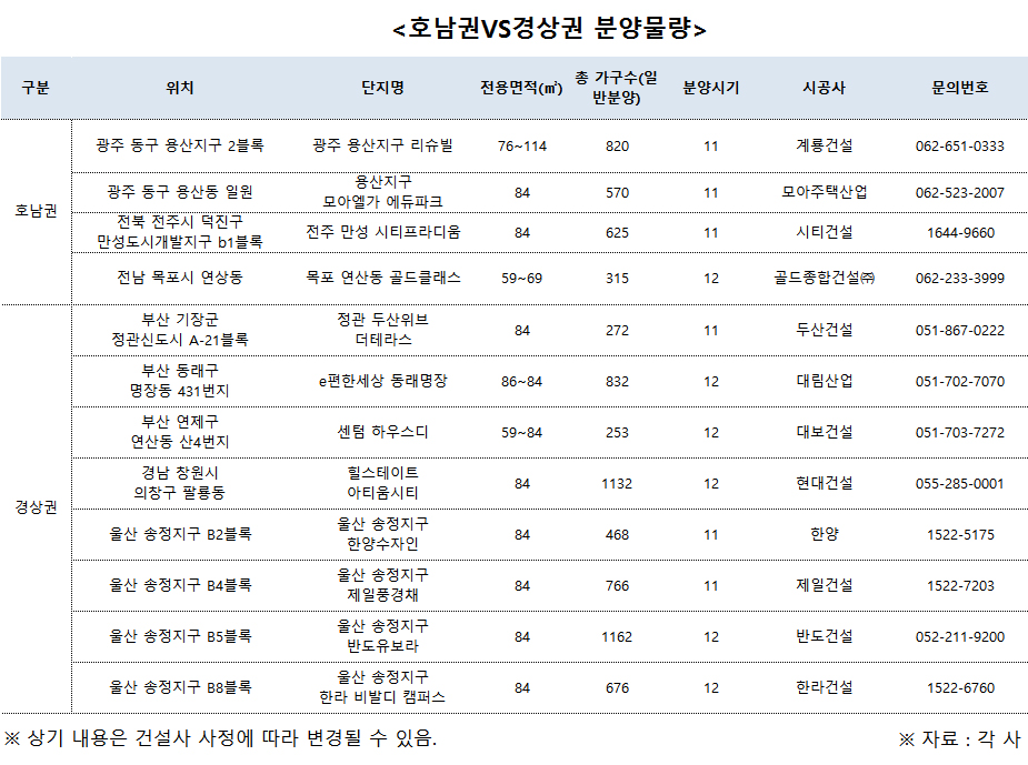 호남권에서는 연말까지 총 5개 단지, 2704세대가 일반 분양을 앞두고 있다. 광주에서는 동구 용산지구에서만 2개 단지 1390세대가 분양될 예정이다. 전남은 장흥과 목포에서 2개 단지 699세대가 공급될 전망이다. 전북에서는 전주에서만 1개 단지 625개 단지가 분양 예정돼 있다.