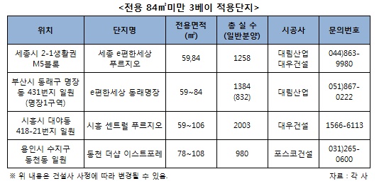 대림산업과 대우건설이 세종시에 민간참여 공공분양 방식으로 공급하는 ‘세종 e편한세상 푸르지오’가 대표적이다. 이 단지의 경우 전용 84㎡에는 4베이 설계로 채광과 통풍을 높인 반면 전용 59㎡에는 3베이 판상형 구조를 적용해 보다 넓은 공간을 효과적으로 활용할 수 있도록 했다. 여기에 일부세대에는 개방형발코니 및 알파룸의 특화설계가 적용된다. 16일 견본주택을 개관하는 ‘세종 e편한세상 푸르지오’는 세종시 2생활권에 들어서는 마지막 분양단지로 2-1생활권 M5블록에 지하 1층~지상 최고 29층 15개동 총 1258가구, 전용 59·84㎡의 중소형 대단지 아파트로 공급된다.