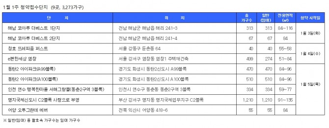 청약접수가 실시되는 단지는 9곳이다. 우선 1월 4일에 2곳에서 청약접수를 실시한다.