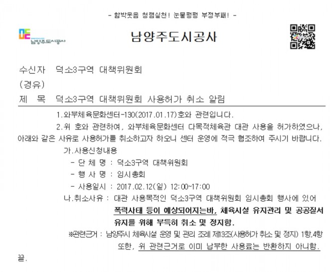 문화센터 관계자는 "임시총회 관련 공고가 나가자 총회 개최에 대해 항의하는 민원이 빗발치듯 몰려와 부득이하게 사용허가를 취소하게 됐다"며 "총회 개최를 강행할 경우 폭력사태가 발생할 수도 있다고 판단할 정도로 민원 강도가 높았다"고 말했다.