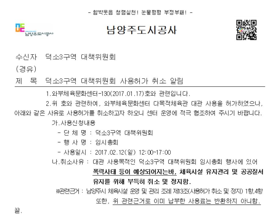 이에 따라 덕소3구역 조합장 해임 총회는 내달 1일로 연기된다. 새롭게 마련된 장소는 덕소초등학교 체육관으로 2시에 해당 임시총회가 개최된다.
