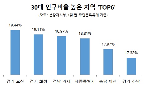 이미지 확대보기행정자치부에서 제공하는 주민등록 인구통계에 따르면 지난달 기준 전국 161개 시·군 중 경기 오산시의 30대 인구 비율은 19.44%로 1위로 집계됐다. 이는 전국 평균(11.82%) 보다 8% 가까이 높은 수치다. 이어 경기 화성시 19.11%, 경남 거제시 18.97%, 세종시 18.81%, 아산시 17.97%, 하남시 17.32% 등이 전국 평균을 훌쩍 넘기고 있다.