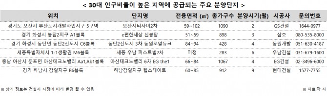 업계 관계자는 “지역 내 30대 인구비중이 높다는 것은 타 지역 대비 분양을 받으려고 하는 실수요자가 많다고 볼 수 있다”며 “특히 이들 지역 신규분양 아파트들은 젊은층 수요자들의 관심을 많이 받는 만큼 건설사들도 30대의 마음을 사로잡기 위해 다양한 특화 설계와 서비스를 선보이고 있다”고 말했다.