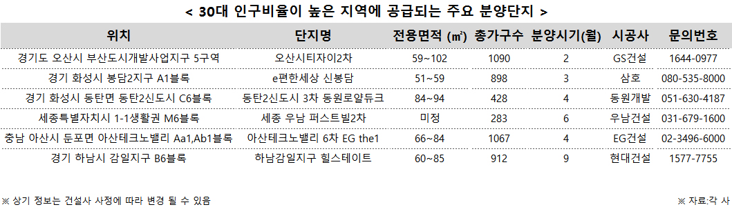 30대는 통상적으로 어린 자녀를 양육하는 경우가 많기 때문에 어린이집이나 학교, 편의시설 등이 잘 갖춰져 있는 곳을 선호한다. 특히 오산과 화성 등 30대가 많은 수도권 주요 도시들은 서울과 접근성이 좋거나 산업단지가 가까워 직주근접을 원하는 실수요자들도 많다.