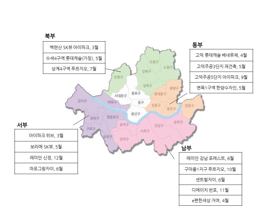 이미지 확대보기업계에 따르면 서울 동부권(강동구 고덕, 중구 신당동, 중랑구 면목), 서부권(양천구 신정, 영등포구 신길, 마포구 염리), 남부권(강남구 개포·대치·청담, 서초구 반포·서초, 송파구 거여), 북부권(노원구 상계, 은평구 응암·수색) 등에서 알짜 단지가 대거 선보인다.