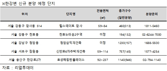그렇다보니 한강변 아파트는 한강이 전해주는 각종 인프라를 누려보기 위한 실수요자와 시세차익을 보려는 투자자까지 몰리면서 꾸준한 인기를 끌고 있다는 게 업계의 분석이다. 이런 가운데 올해도 한강변에서 신규 분양단지들에 대해 관심이 클 것으로 예상된다.