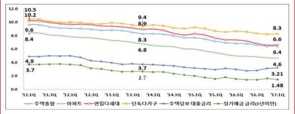 이미지 확대보기정기예금금리는 2월 대비 0.02%p 하락해 1.48%, 주택담보대출금리는 0.02%p 상승해 3.21%를 나타냈다. 주택종합 기준 전월세전환율이 6.4%로 월세 수익률이 높았다.