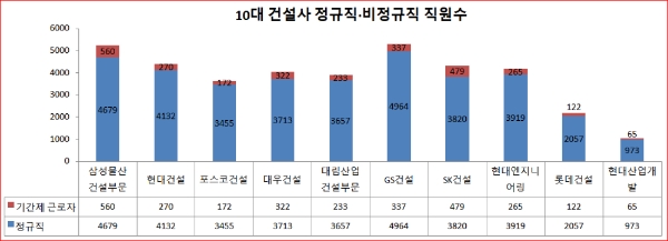 포스코건설의 비정규직 비율은 35.8%, 대우건설은 33.3%, 롯데건설은 27.4%, 현대엔지니어링은 26.7%, 대림산업 건설부문은 19.6%, SK건설은 16.9%, 삼성물산 건설부문은 16.1%, GS건설은 12.8%를 차지했다.
