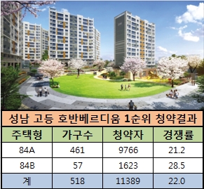 주택형별로는 84A타입과 B타입이 각각 21.2대 1, 28.5대 1의 경쟁률을 보였다.