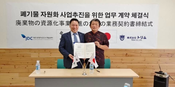 이미지 확대보기제주국제자유도시개발센터(JDC)가 19일 일본 Trim 업체와 업사이클링 클러스터 조성 업무협약을 체결했다. 사진 왼쪽이 이광희 JDC 이사장 / 사진=JDC 제공[글로벌이코노믹 라영철 기자] 제주국제자유도시개발센터(JDC)는 "19일 일본 오키나와에서 (주)Trim과 제주의 환경가치 증진을 위한 '업사이클링 클러스터(Up-Cycling Cluster)' 조성을 위한 업무협약을 체결했다"고 이날 밝혔다.
