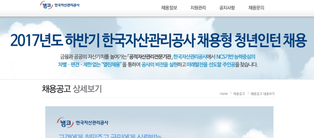 한국자산관리공사는 28일 2017년도 하반기 채용형 청년인턴 필기전형 대상자를 발표한다./한국자산관리공사 홈페이지