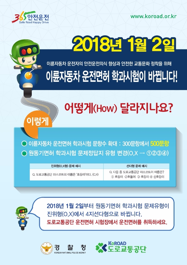 내년부터는 이륜자동차 운전면허 학과시험 문제은행 문항수가 현행 300개에서 500개로 대폭 확대되며, 기존 진위형(O, X)에서 4지선다형으로 유형이 변경된다.