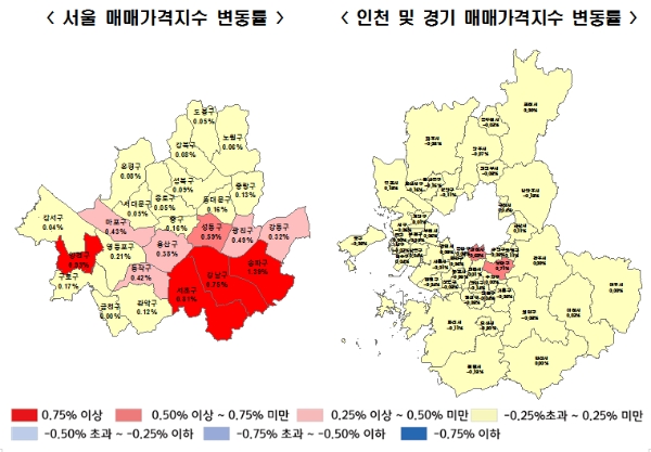서울은 강남3구(서초, 강남, 송파)의 폭발적인 가격 상승에 힘입어 지난주보다 높은 상승률(0.39%)을 기록했다. 강남권에서 송파구가 1.35%의 가격상승률을 보이며 2주 연속 1% 이상 올랐고, 양천구(0.93%)와 서초구(0.81%)가 뒤를 이었다. 강남구 역시 0.75%의 높은 상승률을 기록했다.