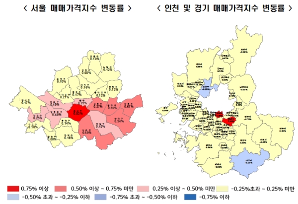 매매가격은 시도별로 서울(0.31%), 광주(0.15%), 전남(0.14%), 경기(0.07%)등은 상승했고, 인천(0.00%)은 보합, 충북(-0.18%), 경남(-0.17%), 경북(-0.15%), 제주(-0.12%) 등은 하락했다.