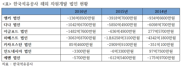 12일 관련 업계에 따르면 2016년 말 기준 석유공사의 해외 자원개발 법인은 총 7곳으로 2014년부터 2016년까지 4조7316억원의 손실을 기록했다.