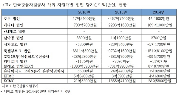 13일 관련업계에 따르면 광물자원공사는 작년 말 기준 취득가액(해외 법인을 살 때 낸 투자금)이 100억원 이상인 자원개발 법인은 총 12곳으로, 2014년부터 2016년까지 적자가 3조4373억4900만원에 달했다.