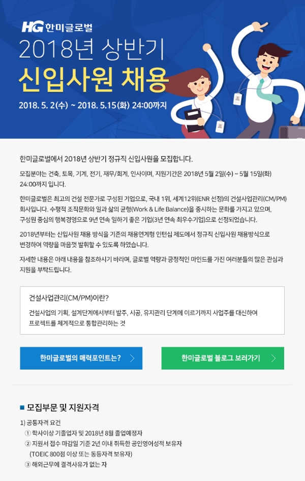 이미지 확대보기한미글로벌(회장 김종훈)은 2일부터 2018년 상반기 정규직 신입사원 모집을 시작한다고 밝혔다.