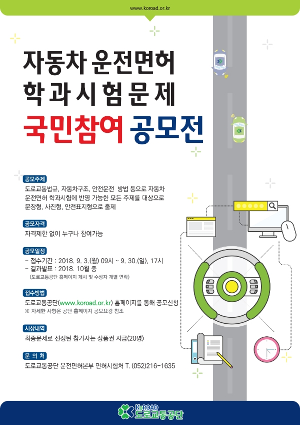 이번 공모전은 법률지식·운전태도·경제운전 등 다양한 분야의 운전면허 시험문제 발굴을 위해 만들어졌다. 교통법규, 자동차구조, 안전운전방법 등 자동차 운전면허 학과시험에 반영 가능한 모든 주제를 대상으로 문제를 모집한다.